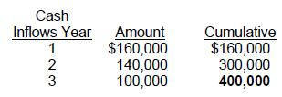 Note: After 3 years, the initial investment is recovered, as the cumulative cash inflows equal $400,000. The cash flows are not discounted when the payback method is used.