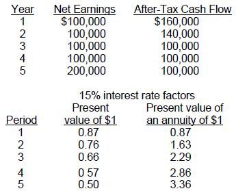 Willis, Inc. has a cost of capital of 15 percent and is considering the acquisition of a new machine, which costs $400,000 and has a useful life of five years. Willis projects that earnings and cash flow will increase as follows.