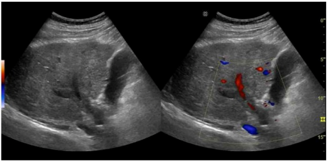 The sonographic images depict an acute thrombotic process involving the portal venous system. The absence of cavernous transformation in the setting of portal vein thrombus indicates that the process is acute. In chronic portal vein thrombosis, collateral vessels form in the porta hepatis to bypass the obstruction, a process known as cavernous transformation.