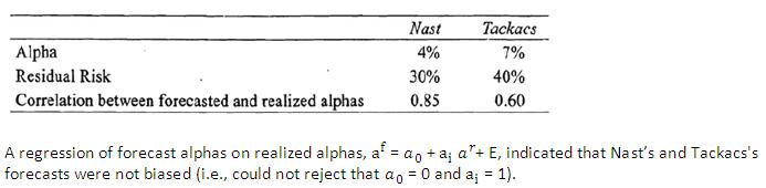 In further discussion, Benesh recommends that MPTA consider subscribing to the investment newsletters of two independent equity analysts: Jack Nast and Elizabeth Tackacs. Their alphas, residual risk, and correlation between forecasted and realized alphas arc provided in the table below.