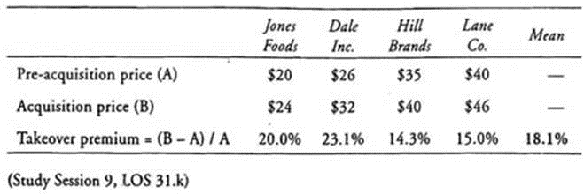 Based on pre-acquisition prices of $20 for Jones Foods, $26 for Dale Inc., S35 for Hill Brands, and $40 for Lane Co., the mean takeover premium for Flavoring would be closest to;