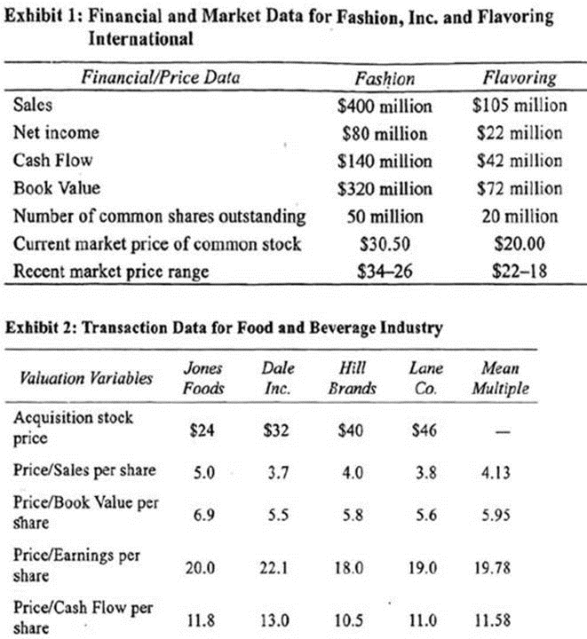 Silver has consulted with the company's investment bankers concerning possible merger targets. The most promising merger target is Flavoring International, a distributor of a broad line of gourmet spices in the United States and numerous other countries. In recent years, Flavoring's earnings growth rate has been above competitors' and also has exceeded Fashion's experience. Superior income growth is projected to continue over at least the next five years. Silver is impressed with the appeal of the company's products to upscale customers, its strong operating and financial performance, and Flavoring's dynamic management team. He is contemplating retirement in three years and believes that Flavoring's younger, more aggressive senior managers could boost the combined company's growth through increasing Fashion's operating efficiency and expanding Fashion's product line in countries outside the United States. Alan Smith, who is Silver's key contact at the investment banking firm, indicates that a key appeal of this merger to Flavoring would be Fashion's greater financial flexibility and access to lower cost sources of financing for expansion of its products in new geographic areas. Fashion has a very attractive performance based stock option plan. Flavoring's incentive plan is entirely based on cash compensation for achieving performance goals. Additionally, the 80% of Fashion's stock not controlled by management interests is very widely held and trades actively. Flavoring became a publicly held company three years ago and doesn't trade as actively.