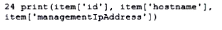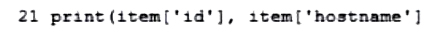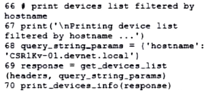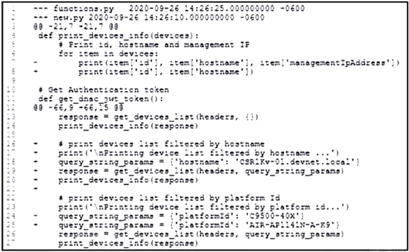 The provided diff format shows changes between two versions of a file. The + signs indicate lines that have been added in the new file (new.py). The code snippet that belongs to the new file is the one with + signs, showing the addition of code to print the device list filtered by hostname. The added lines include printing the message and setting the query_string_params to filter by hostname.