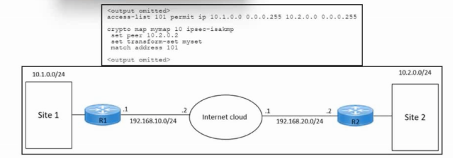 Refer to the exhibit. An engineer must configure an IPsec VPN connection between site 1 and site 2. The indicated configuration was applied to router R1; however, the tunnel fails to come up. Which command must be run on R1 to resolve the issue?