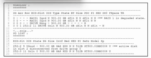 In the PD LIST, one disk (slot 2) is marked ''UGood -- active disk in slot 2 disconnected from drive group 0'', while the other (slot 3) is ''Onln 0'' (online and part of drive group 0).