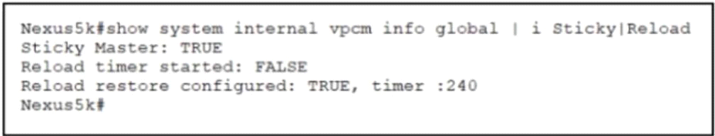 Refer to the exhibit. During a maintenance window of the Nexus switch pair, one of the Cisco Nexus chassis was brought offline for maintenance. The primary Cisco Nexus switch was stable during the maintenance window. After finishing the