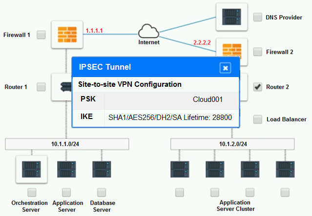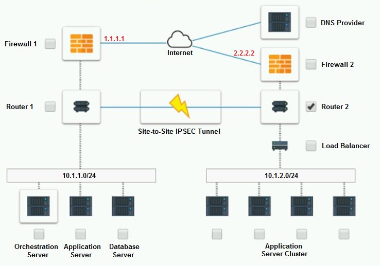 The remote computing environment is connected to the on-premises datacenter via a site-to-site IPSec tunnel. The external DNS provider has been configured to use weighted round-robin routing to load balance connections from the Internet.