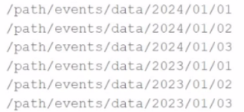 Option D is incorrect because it will only read files directly within /path/events/data/ and not subdirectories like /2023/01/01.