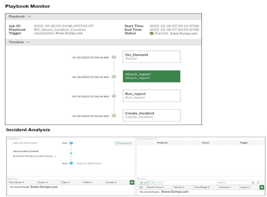 The Playbook Monitor dashboard and the analysis of the corresponding incident analysis are shown. You created the playbook with the objective of automatically attaching the report to the incident that was created. Which two statements are correct? (Choose two answers)