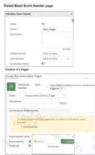 A partial Basic Event Handler page on FortiAnalyzer and the creation of a trigger in a FortiGate device are shown. To improve the protection of your OT network, you want to automate the handling of compromised devices notified through FortiAnalyzer. You have configured an event handler named Alert_trigger as shown in the exhibit. When you create the trigger on the FortiGate device, the Event handler name field does not provide the Alert_trigger option. What two actions must you perform to make the Alert_trigger option available? (Choose two answers)