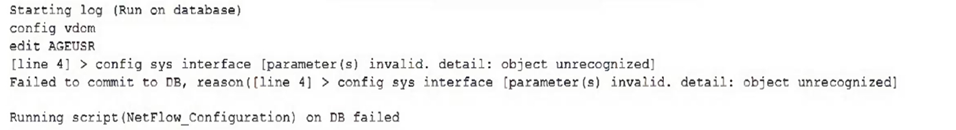 While attempting to push a NetFlow configuration script through the FortiManager policy package: an administrator encounters an error stating that an object is unrecognized in line 4.