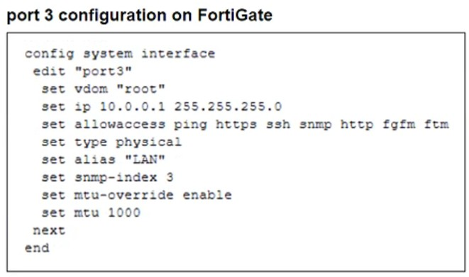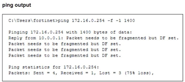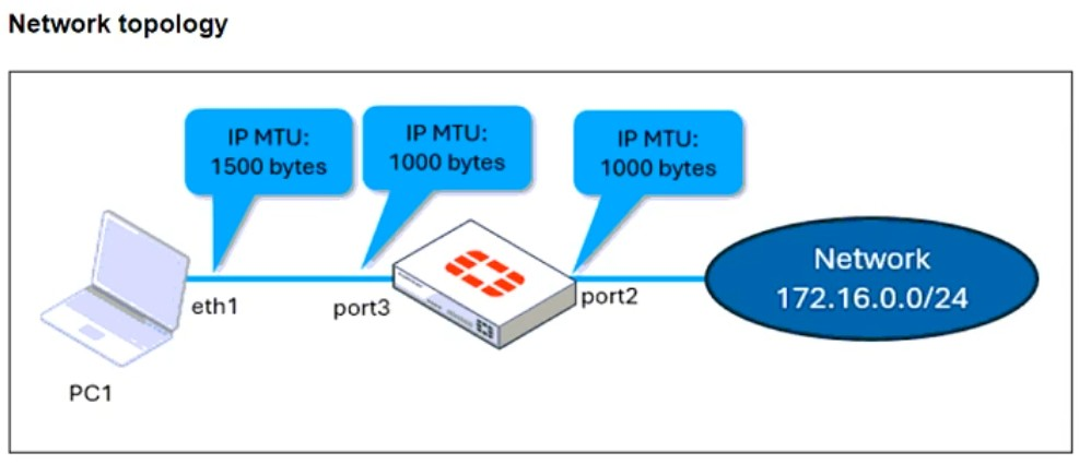 The configuration of a user's Windows PC, which has a default MTU of 1500 bytes, along with FortiGate interfaces set to an MTU of 1000 bytes, and the results of PC1 pinging server 172.16.0.254 are shown.
