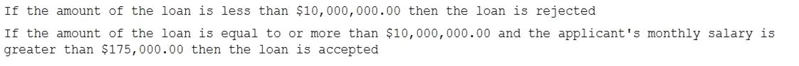 If the amount of the loan is equal to or more than $10,000,000.00 and the applicant's monthly salary is greater than $175,000.00 then the loan is accepted