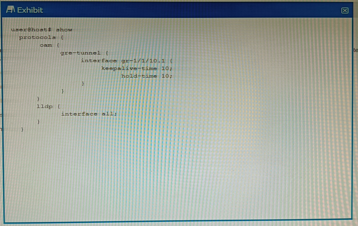 In the exhibit, the configuration shows that the keepalive-time is set to 10 seconds and the hold-time is set to 15 seconds for the gr-1/1/10.1 interface. This means that the local router will send a keepalive packet every 10 seconds and will wait for 15 seconds for a reply from the remote router. However, this hold-time value is not two times the keepalive-time value, which violates the recommended configuration. This may cause traffic drops if the remote router takes longer than 15 seconds to reply.