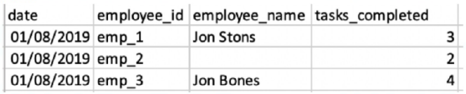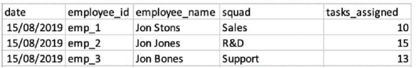 Hence, when filtering on the entire date range (1-30/8), the resulting view will align with the structure of the parent data stream, showing the KPIs ('Tasks Completed' from File A and 'Tasks Assigned' from File B) alongside the employee names and squads from the respective files. Since the employee IDs align, the data can be linked properly. However, since the dates do not align (File A data is from 01/08/2019 and File B from 15/08/2019), only attributes from File B will be updated without date association.
