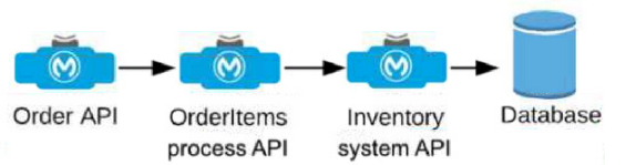 An Order API triggers a sequence of other API calls to look up details of an order's items in a back-end inventory database. The Order API calls the OrderItems process API, which calls the Inventory system API. The Inventory system API performs database operations in the back-end inventory database.