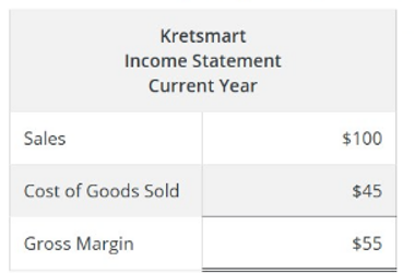 When sales grow and cost of goods sold (COGS) is assumed to be a spontaneous account, COGS increases proportionally with sales. In the current year, Kretsmart's gross margin ratio is calculated as Gross Margin Sales = $55 $100 = 55%, while COGS represents 45% of sales.